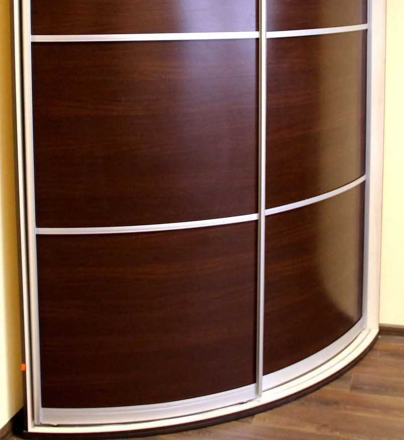 Радиусный шкаф-купе под заказ отличается от конкурентов оригинальной формой и изогнутыми дверями раздвигающимися по кругу. Дизайн радиусного шкафа скрывает углы комнаты, делает интерьер плавным и менее грубым.